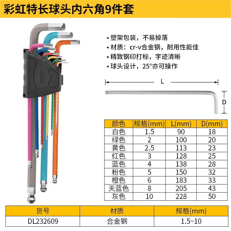 专业级镜面彩虹特长球头内六角组套9件套铬钒钢(黑(套(售完取消);DL232609