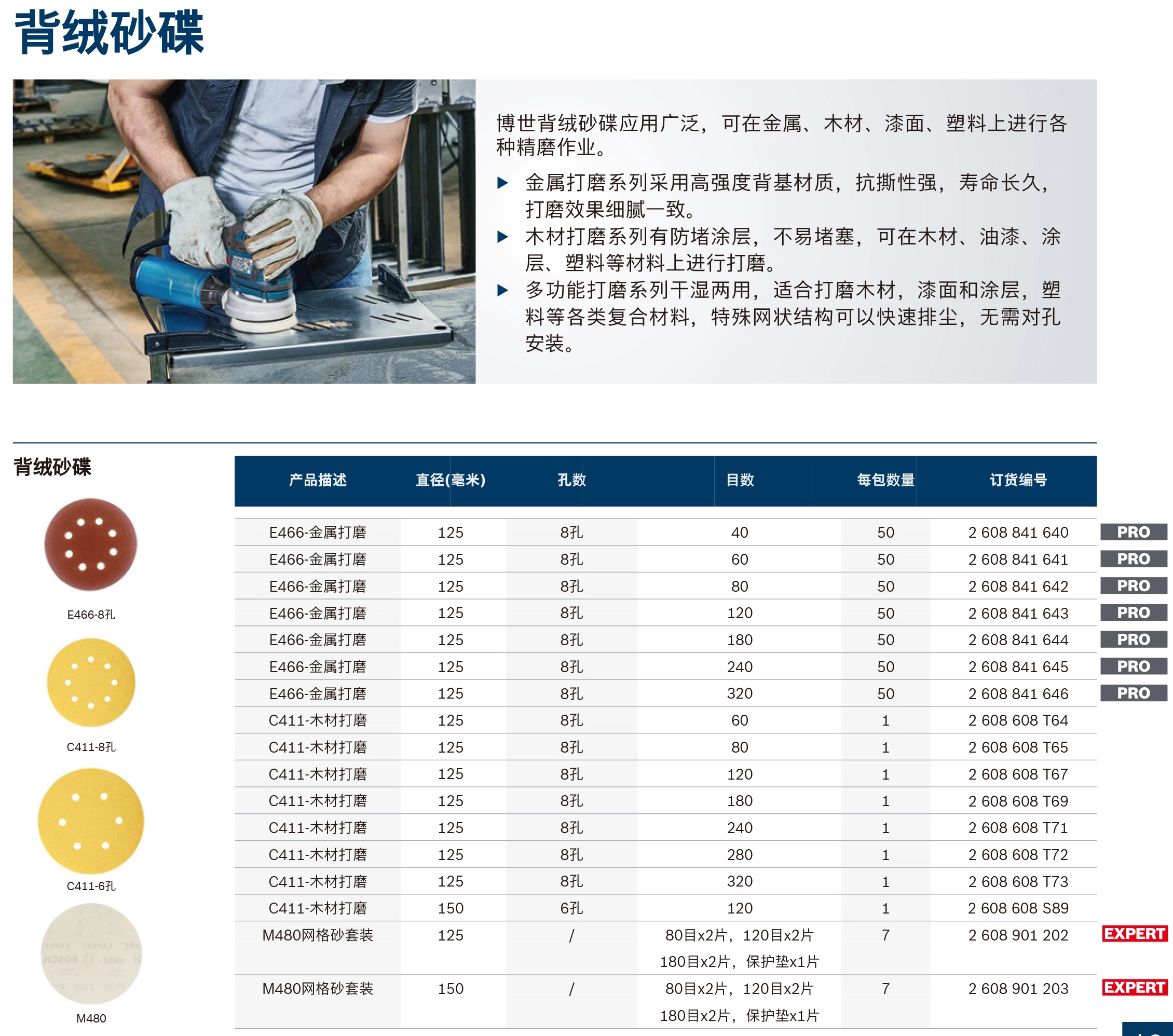 专业级E466背绒砂碟 125mm8孔40目(50片装);2608841640