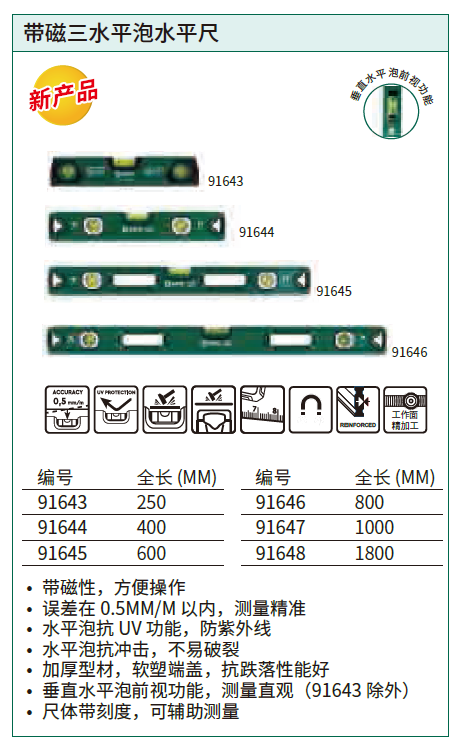 ● 带磁性,方便操作 ● 误差在0.5MM/M以内,测量精准 ● 水平泡抗UV功能,防紫外线 ● 水平泡抗冲击,不易破裂 ● 加厚型材,软塑端盖,抗跌落性能好 ● 垂直水平泡前视功能,测量直观 ● 尺…