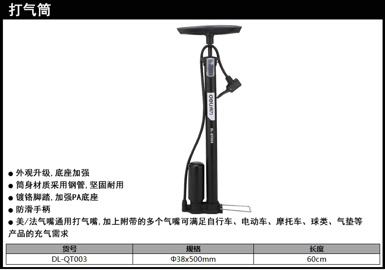 打气筒Φ32x480mm双增压(黑)(个);DL-QT003