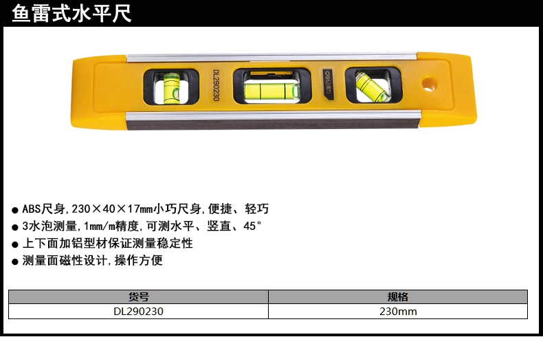 水平尺230mm鱼雷式(黄)(把);DL290230