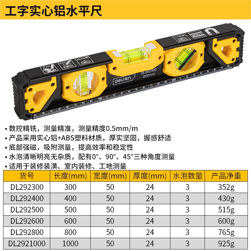 水平尺300mm工字实心铝0.5mm/m(黄)(把);DL292300