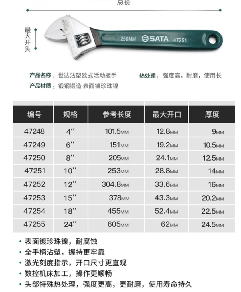 47255 沾塑欧式活动扳手24″ ● 表面镀珍珠镍,耐腐蚀、更美观 ● 全手柄沾塑,握持更牢靠 ● 激光刻度指示,开口尺寸更直观 ● 头部特殊热处理,强度更高,更耐磨 ● 本品属易耗品,不属于世达终…