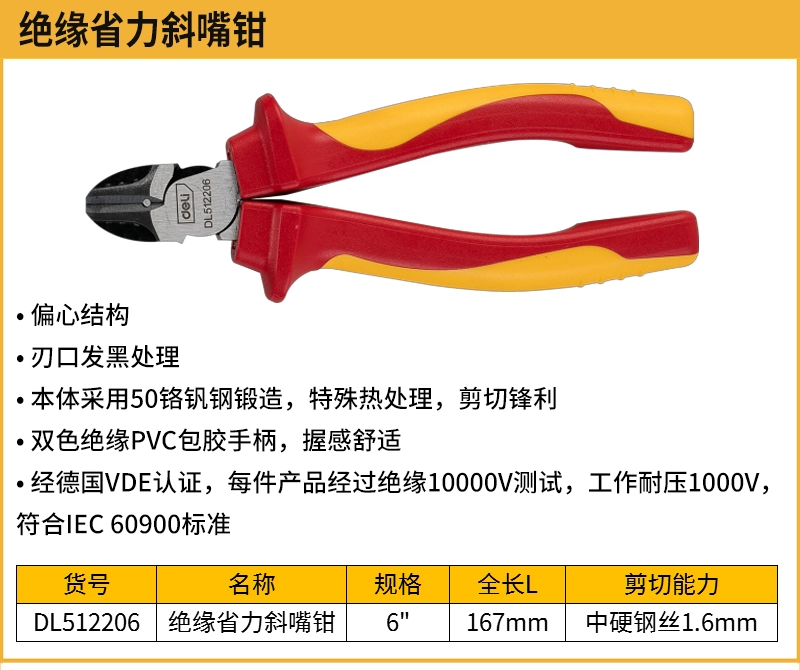 绝缘省力型斜嘴钳6寸(红)(把);DL512206