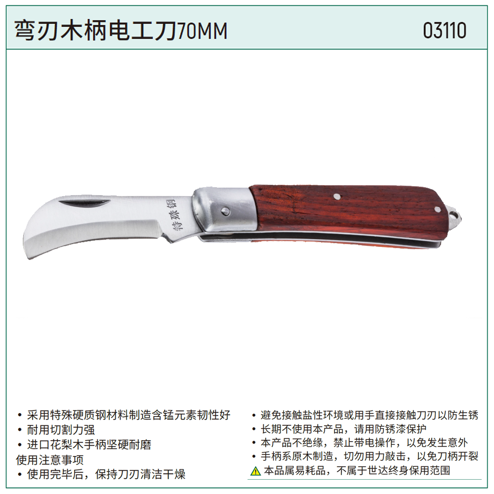 直刃木柄电工刀70MM ; 03109