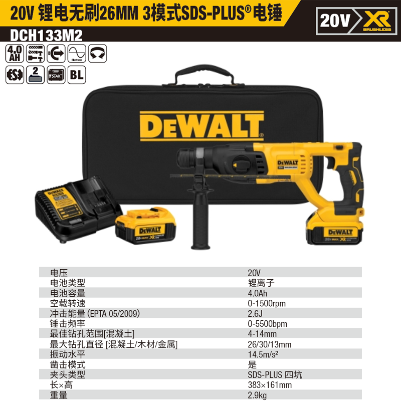 dewalt/得伟20V锂电无刷电锤 2×4.0Ah电池套装;DCH133M2-A9