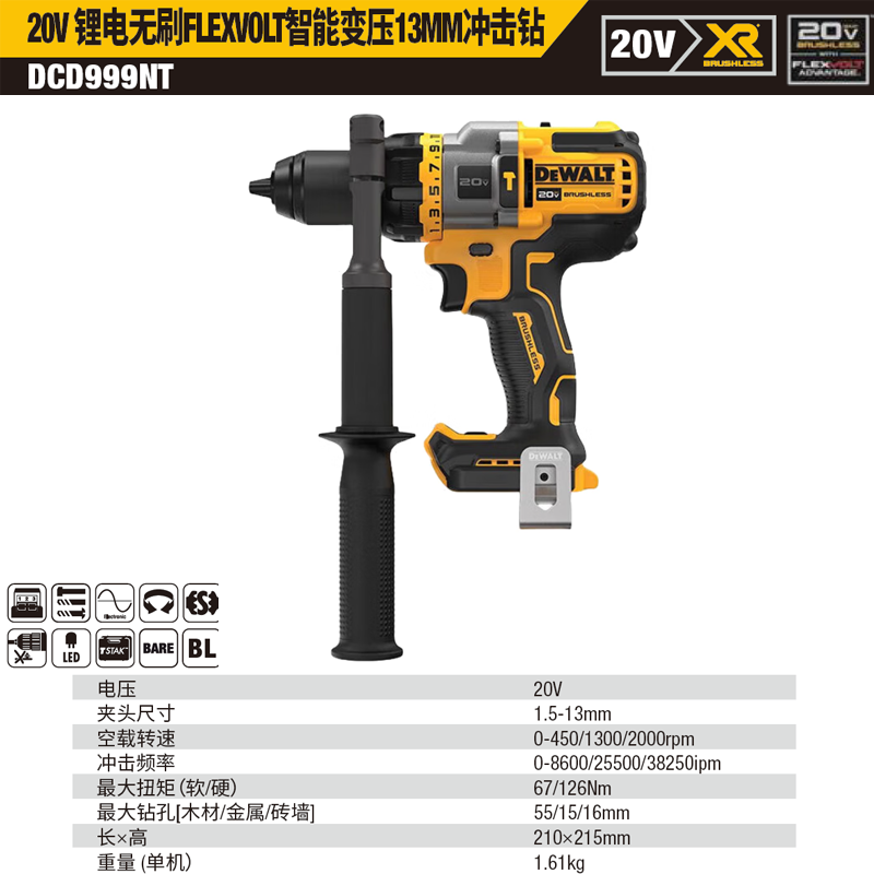 20V锂电无刷FLEXVOLT智能变压13mm冲击钻单机TSTAK;DCD999NT-A9