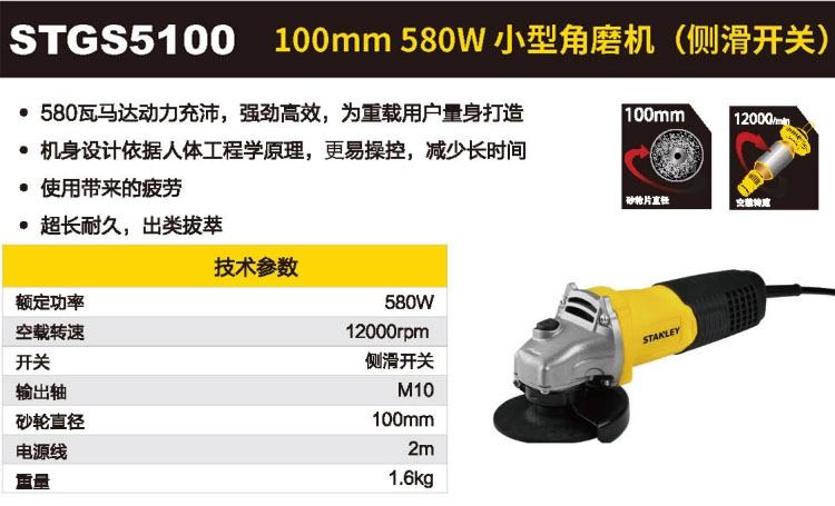 580W 100mm 角磨机(侧滑开关)[已停产,更新为SG6100-A9];STGS5100-A9