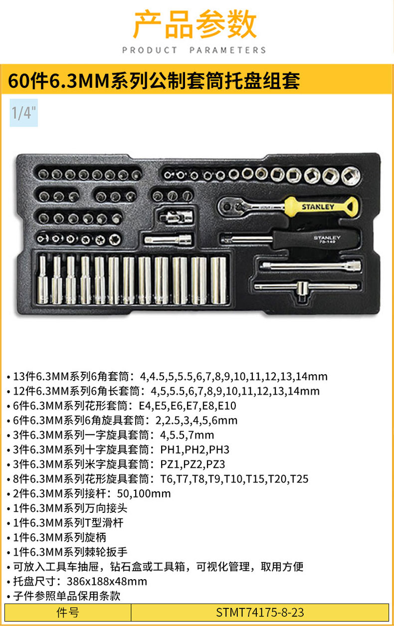 60件6.3MM系列公制套筒托盘组套;STMT74175-8-23