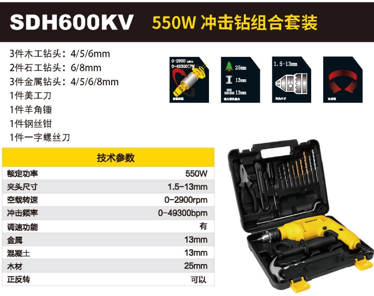 600W 13mm 冲击钻 套装;SDH600KV-A9
