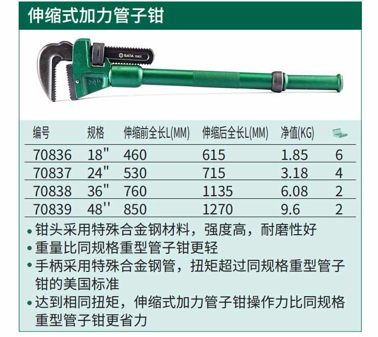 促销中 Previous Product Next Product 铝合金管子钳48″ ; 70829 ¥1,329.00 原价为:¥1,329.00。¥1,329.00当前价格为:¥1,329.00。 铝合金管子钳48" ; 70829 数量 加入购物车 SKU: 70829 分类: 世达五金 品牌: SATA/世达 其他信息 用户评价 (0) 其他信息 重量 8.14 公斤 评价 目前还没有评价 成为第一个“铝合金管子钳48″ ; 70829” 的评价者 取消回复您的邮箱地址不会被公开。 必填项已用 * 标注您的评级 * 评价… 完美 很好 普通 还行 极差 您的评价 *名称 * 电子邮件 * 在此浏览器中保存我的显示名称、邮箱地址和网站地址,以便下次评论时使用。 相关产品 快速查看 促销中 快速查看 世达五金5件套无铅烙铁头2C型(马蹄形) ; 02027 ¥106.00 原价为:¥106.00。¥106.00当前价格为:¥106.00。 加入购物车 5件套无铅烙铁头2C型(马蹄形) ; 02027 SKU: 02027 分类: 世达五金 品牌: SATA/世达 ¥106.00 原价为:¥106.00。¥106.00当前价格为:¥106.00。 快速查看 促销中 快速查看 世达五金1″气动冲击扳手(8″轴) ; 01132 ¥2,999.00 原价为:¥2,999.00。¥2,999.00当前价格为:¥2,999.00。 加入购物车 1″气动冲击扳手(8″轴) ; 01132 产品介绍 ● 适用于大型客车的轮胎拆装,以及大型机械设备的拆装和维修。 ● 主要零件采用真空热处理和超低温淬火工艺,硬度高,韧性好,耐磨性好,产品寿命长 ● 8″输出轴(01132)适用于大型客车轮胎的拆装 ● 2″输出轴(01132S)适用于狭小空间操作 SKU: 01132 分类: 世达五金 品牌: SATA/世达 ¥2,999.00 原价为:¥2,999.00。¥2,999.00当前价格为:¥2,999.00。 快速查看 促销中 快速查看 世达五金彩虹系列9件特长球头内六角扳手组套 ; 09101CH ¥139.00 原价为:¥139.00。¥139.00当前价格为:¥139.00。 加入购物车 彩虹系列9件特长球头内六角扳手组套 ; 09101CH ● 彩色护套,快速辨识产品,耐油防滑 ● 软塑插孔托架,不易破裂,防止产品滑出 ● 特殊表面处理,确保尺寸精度 SKU: 09101CH 分类: 世达五金 品牌: SATA/世达 ¥139.00 原价为:¥139.00。¥139.00当前价格为:¥139.00。