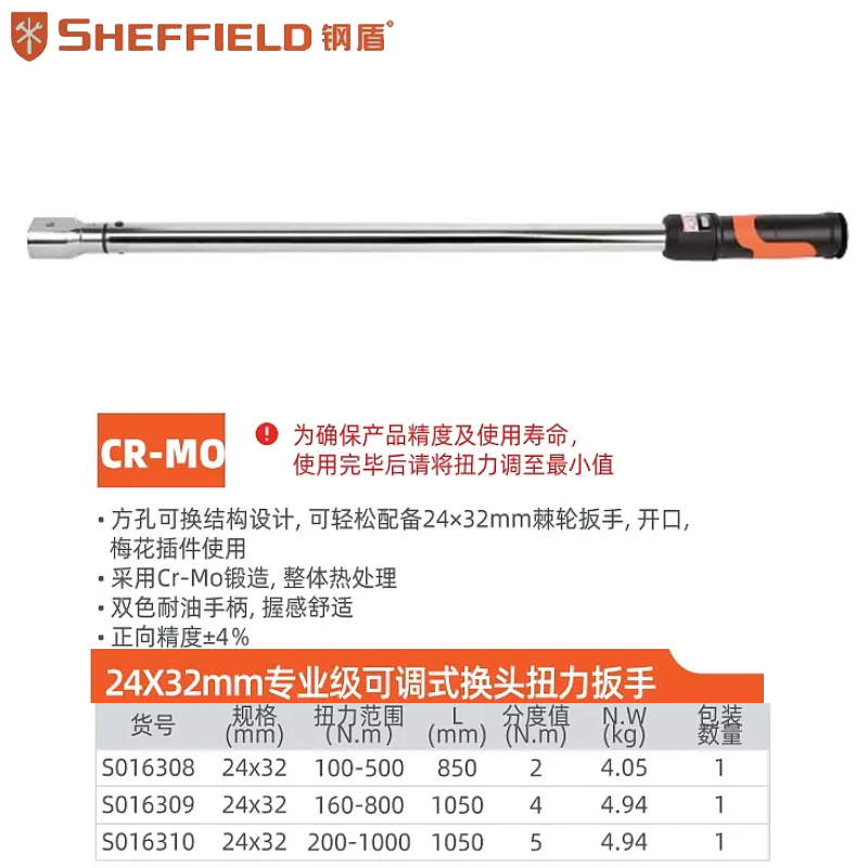 成为第一个“24X32mm系列专业级可调式换头扭力扳手100–500N.m;S016308” 的评价者
