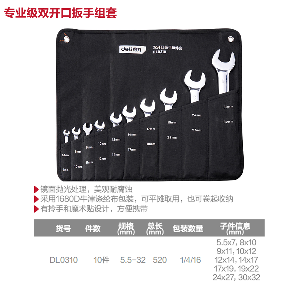 镜面双开口扳手套装10件套布包铬钒钢(银)(套);DL0310