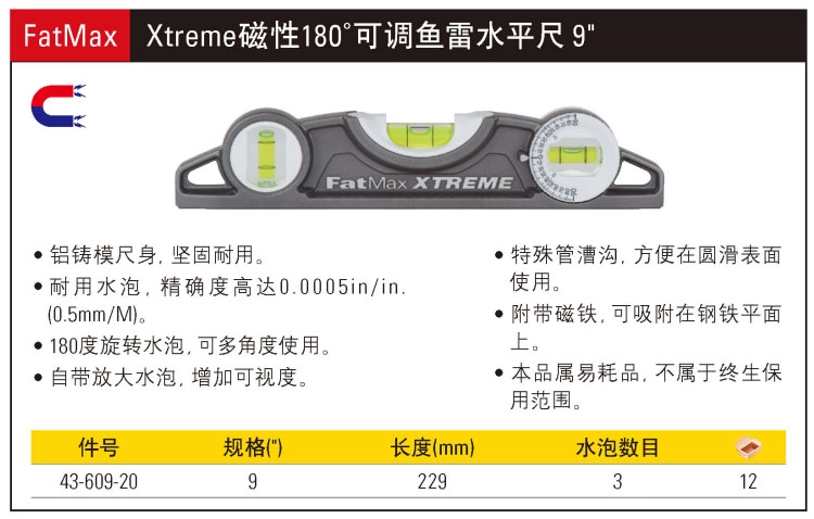 FatMax XTREME磁性180°可调鱼雷水平尺9″;43-609-20